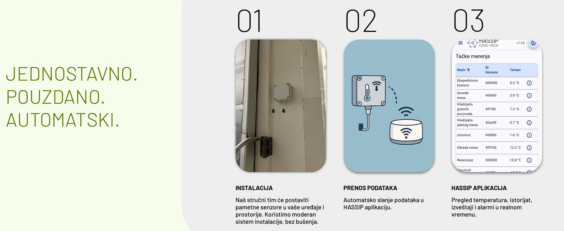 - Praćenje temperature u realnom vremenu. Bez obzira da li ste na putu, ili na odmoru, ili jednostavno niste na poslu, digitalni termometri, preko HASSIP aplikacije na mobilnom telefonu pratite temperature u svim rashladnim urešajima.