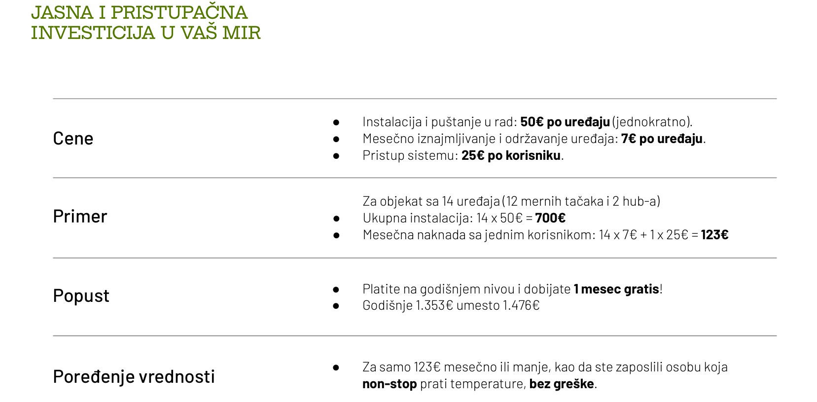 Kao da ste zaposlili jednu osobu da vam za 112 eura obavlja sve ovo gore navedeno, a u obuku zapsolenog ste uložili 700 eura (i nema potrebe za dodatnim obukama, jer su u pitanju digitalni termometri koji se redovno programski updejtuju.